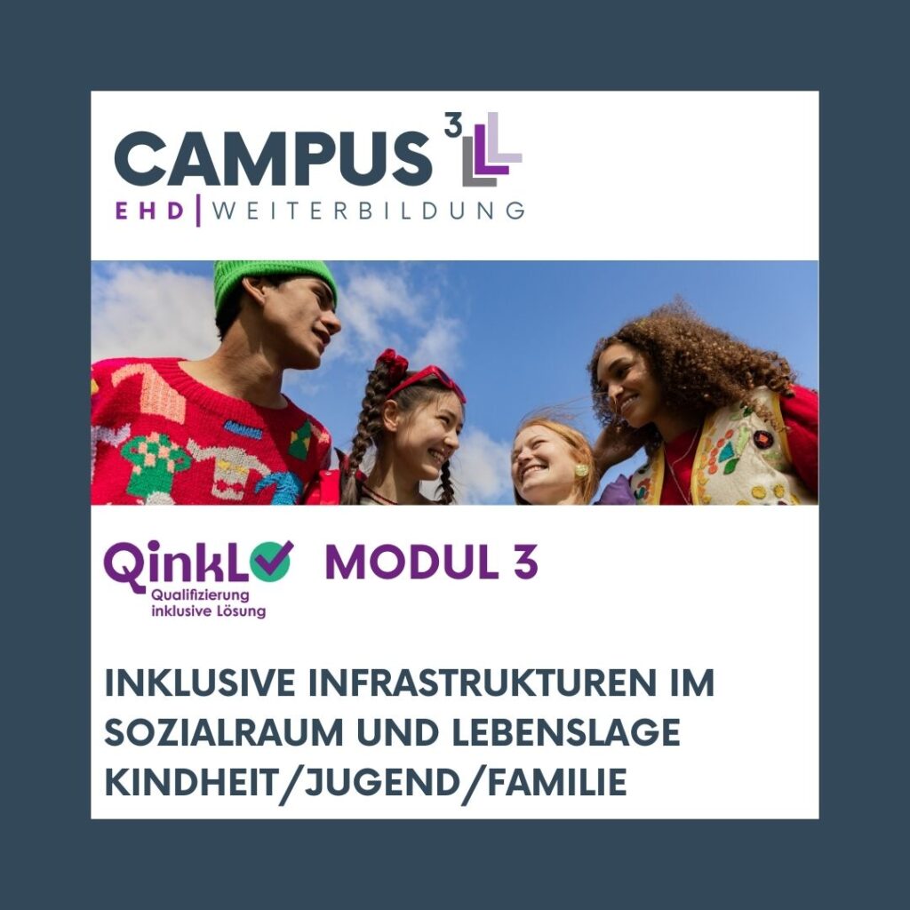 Vor diesem Hintergrund steht der Zertifikatskurs QinkL. Er greift die aktuellen Entwicklungen hin zu einer inklusiven Ausgestaltung von Bildungs- und Unterstützungsangeboten auf, wie sie insbesondere im Zuge der Reform des SGB VIII und der sogenannten „inklusiven Lösung“ vorgesehen sind.